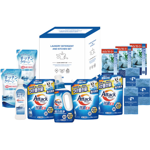 内容 ●花王アタック抗菌EX本体750g・キッチンクリーン250ml×各1、キッチンクリーン詰替200ml×2、花王アタック抗菌EX詰合900g・マイクロファイバークロス(約20×20cm)・メッシュクリーナー×各3 【化粧箱入】