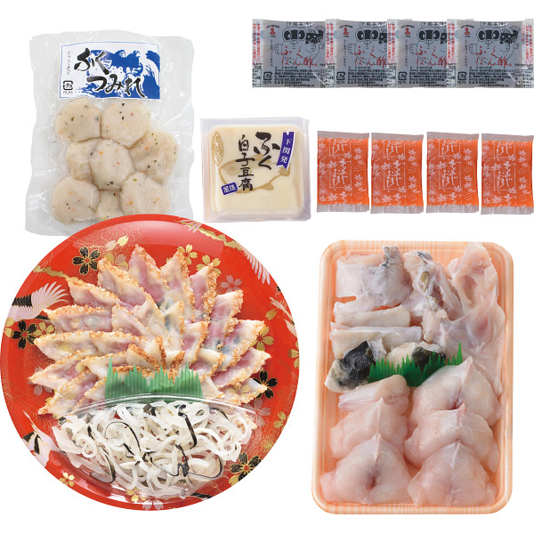 内容 ●真ふぐたたき刺身(22cm皿)55g、とらふぐ皮20g、ふぐちり(シロサバフグ切身、トラフグアラ)360g、ふぐ白子豆腐130g、ふぐつみれ100g、ふくポン酢10g×4、もみじおろし10g×4(マフグ:山口県産、トラフグ:長崎県産・熊本県産養殖、シロサバフグ:福岡県産・長崎県産) 【賞味期限:90日】 【アレルゲン:乳成分・小麦】 【発泡スチロール】