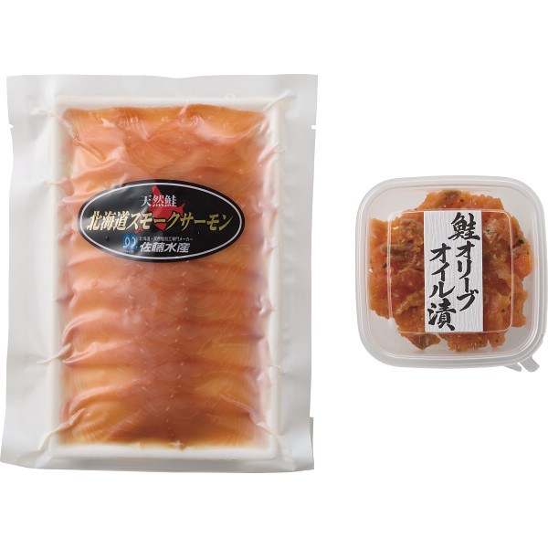 北海道産秋鮭をヒッコリーチップでソフトにスモークし鮭の旨味を引き出した使いやすいスライスタイプのスモークサーモンと、北海道産秋鮭の刺身状の身をオリーブオイルを加えてスモーク風味にした洋風料理に良く合う新感覚の珍味、鮭のオリーブオイル漬。洋風でいただけるサーモンのオードブルをセットでお届け致します。