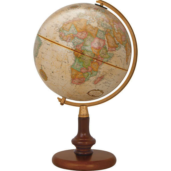 山岳部には隆起の加工が施され、陸地は国別に色分けされた行政地図です。丁寧にろくろ加工された木製の円形架台とクラシック調の球体がお部屋の雰囲気によく調和し、インテリアとしても人気の商品です。