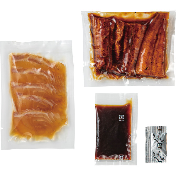 内容 ●うなぎ蒲焼(うなぎ:国産使用)60g・たれ20ml・山椒0.2g・鯛漬け60g×各4 【賞味期限:90日】 【アレルゲン:小麦】 【白箱入】