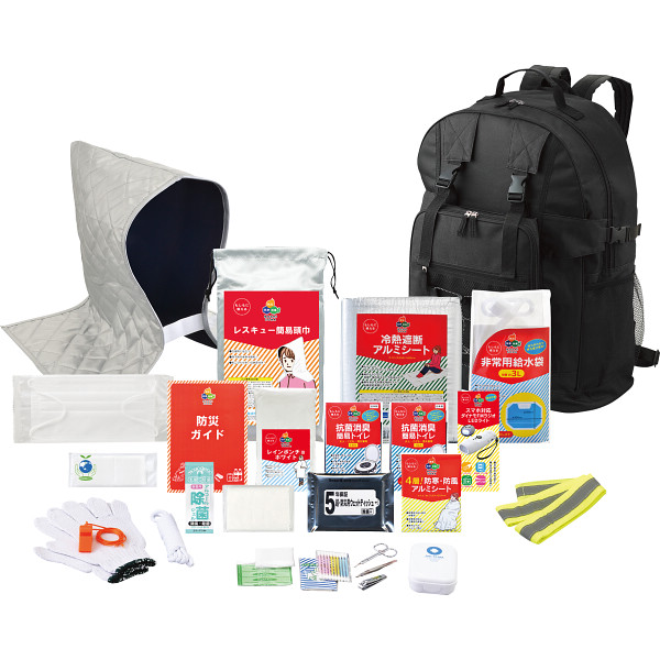 内容 ●大容量リュック・4層!防寒防風アルミシート・冷熱遮断アルミシート・スマホ対応ダイナモFMラジオLEDライト・絆創膏5枚・綿棒10P・コットンパフ3枚・ワンタッチ包帯・爪切り・毛抜き・ハサミ・5年保証超防災用ウェットティッシュ(20枚入)・レインポンチョ(ホワイト)・レスキュー簡易頭巾・軍手・ロープ・笛・新反射安全タスキ・非常用給水袋3l・防災ガイド・除菌ジェル・eco便利バッグ・ポケットティッシュ・マスク×各1・抗菌消臭簡易トイレ×2 【白箱入】