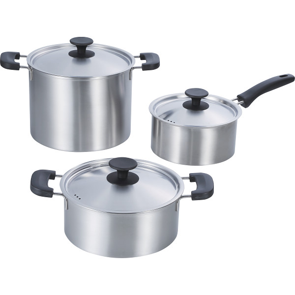 調理の際の目安になる、目盛付のお鍋のセットです。本体は、耐久性に優れたステンレス製で、IHクッキングヒーターやガスコンロなど、色々な熱源でご使用頂けます。