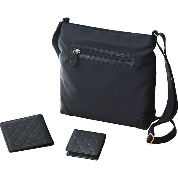 日本製の軽くて使いやすいナイロンショルダーと同じく日本製の牛革のお財布、小銭入れの3点セット。お財布は、小銭入れを無くしカードがたくさん入るようにした薄型タイプです。