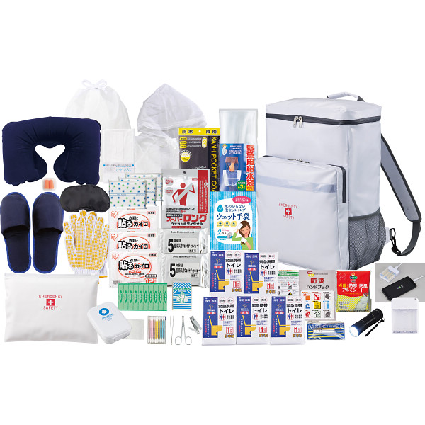 内容 ●リュックバッグ・アルミ製9光LEDライト(単4電池×3本使用・別売)・モバイルチャージャー(アルカリ単3電池×4本使用・別売)・ホイッスル・防寒アルミシート・レインコート・給水袋・マスク・ロングウェットボディタオル・シャンプー手袋・軍手・衣類収納巾着袋・首枕・耳栓・アイマスク・スリッパ・スライダー付ケース・爪切り・ハサミ・毛抜き・絆創膏10枚・綿棒10本・ワンタッチホータイ・コットンパフ・プラ収納ケース・防災ハンドブック×各1、ウェットティッシュ×2、ポケットティッシュ・カイロ×各3、緊急携帯トイレ1回用×5 【ボール箱入】