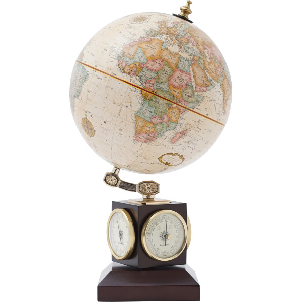 山岳部には隆起の加工が施され、陸地は国別に色分けされた行政地図です。球は落ち着いた輝きの真ちゅうメッキのアームに支えられ、自由に回転する木製の立方体の側面には、湿度計、気圧計、温度計がセットされています。小さなスペースにもフィットするコンパクトサイズのギフトに最適な地球儀です。