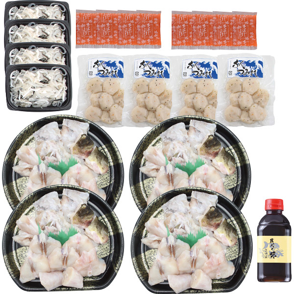 内容 ●とらふぐちり(切身、アラ)400g×4、とらふぐ皮100g×4、ふぐつみれ100g×4、ふくポン酢300ml、もみじおろし10g×8(トラフグ:長崎県産・熊本県産養殖) 【賞味期限:90日】 【アレルゲン:小麦】 【発泡スチロール】