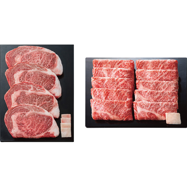 黒毛和牛のロースをすき焼きとステーキにした贅沢なセットです。是非ともご賞味下さい。
