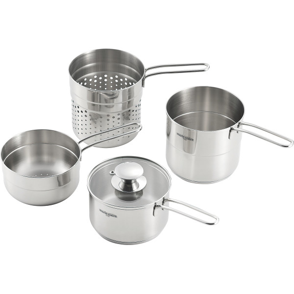 内容 ●ソースパン14cm=容量約1.2l(深さ約8.1cm)、深型ソースパン14cm=容量約1.8l(深さ約12.4cm)、スチーマー=深さ約7.9cm、ストレーナー14cm=深さ約14.1cm、●ガスコンロ可、100・200V電磁調理器対応 【白箱入】 【完成品】
