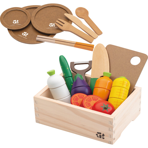 内容 ●トマト、ナス、ニンジン、ダイコン、トウモロコシ、キュウリ、包丁、まな板、収納木箱、ピーラー、大皿、中皿、小皿、ナイフ、フォーク、スプーン、ハシ×各1●対象年齢:3歳~ 【化粧箱入】