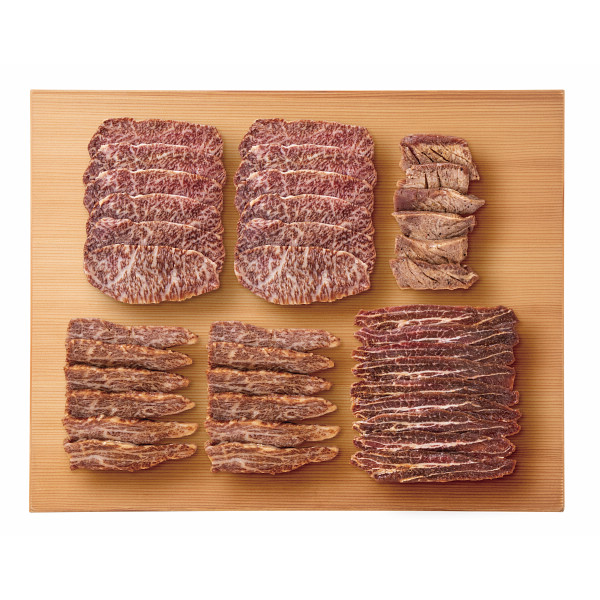 内容 ●味付き国産牛ホホ肉125g、味付き上牛タン100g、味付き特製黒毛和牛カルビ125g×2、味付き特製黒毛和牛ロース110g×2 【アレルゲン:小麦】 【化粧箱入】