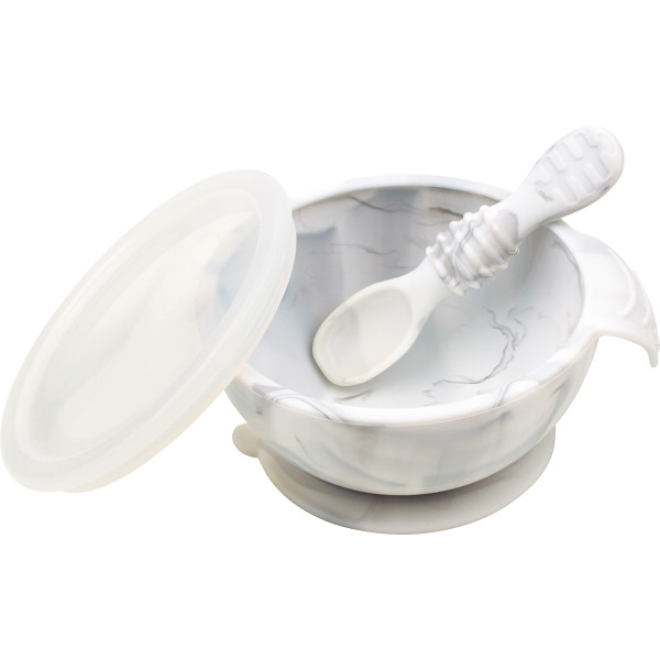 ピタッと吸着!ひっくり返らない吸盤付き食器。しっかりくっつく吸盤でひっくり返らず、食べ散らかしのイライラ解消にも。自分で食べるお子様の練習にもぴったりです。ボウル・フタ・スプーンの3点セット。