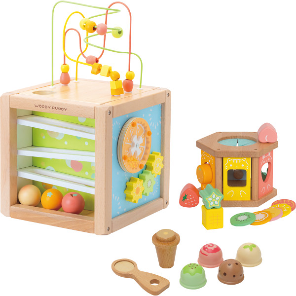 神戸発のオリジナル木製玩具ブランドの知育セットです。ボール転がしができるアクティビティボックスとポットン落としもできるカタハメパズルと埋め込み式マグネットでくっつくアイスクリームがついています。