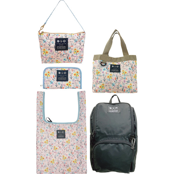 開閉部が大きく出し入れがしやすいリュックとノスタルジックな柄のミニトート、ミニバッグ、マルチケース、エコバッグのセット。