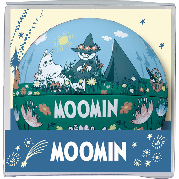 チョコクランチ入りのムーミンの可愛いボール型の缶。どこから見ても可愛らしいムーミンと仲間たちのイラストをお楽しみください。