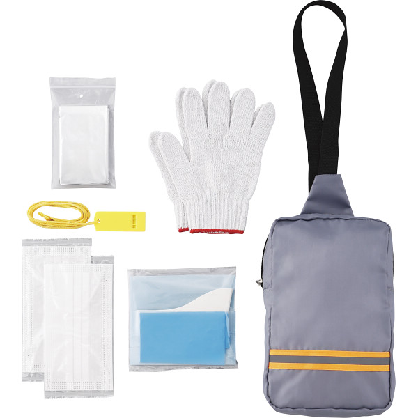 内容 ●反射テープ付防災バッグ・携帯トイレセット・アルミブランケット・ホイッスル・軍手×各1、マスク×2 【袋入】 【完成品】