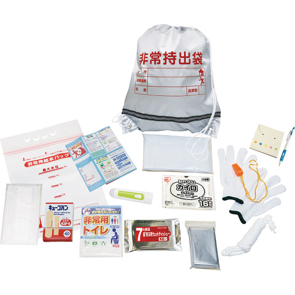 内容 ●非常袋、ハンディライト、非常用給水バッグ5l、非常用トイレ、防災用ウエットティッシュ20枚、防寒シート、軍手、ロープ3m、笛、救急絆創膏2サイズ40枚入(医療機器届出番号43B2X10001000020)、付箋メモ、ボールペン、カイロ、マスク、タオル、防災ガイド 【ボール箱入】 【完成品】