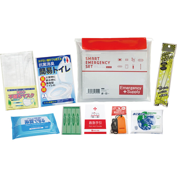 内容 ●防水ポーチ・抗菌消臭簡易トイレ・マスク・絆創膏5P(医療機器届出番号27B3X00138000001)・除菌アルコールウェットティッシュ・救急手引・ホイッスル・水に流せるペーパー・発光スティック 【袋入】