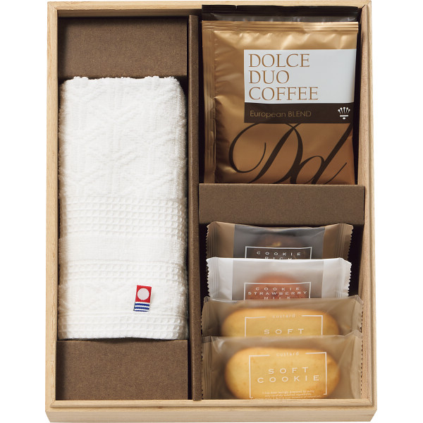 内容 ●今治産ウォッシュタオル(約34×35cm・綿100%・日本製)1枚・ソフトクッキー×2・クッキー(いちごミルク×1・ココア×1)・ドリップコーヒー×2 【賞味期限:90日】 【アレルゲン:卵・乳成分・小麦】 【木箱入】 【完成品】