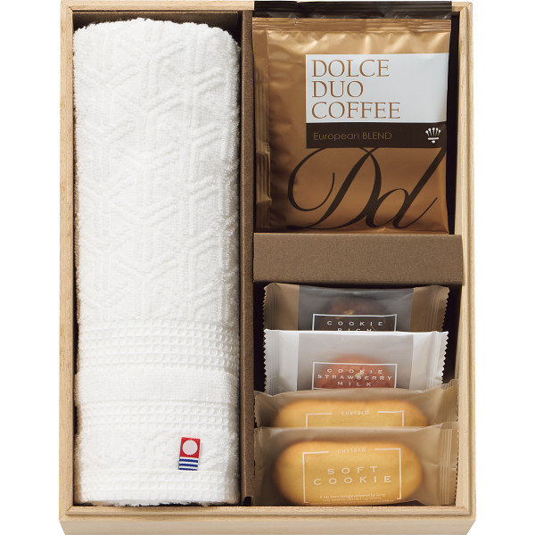 内容 ●今治産フェイスタオル(約34×75cm・綿100%・日本製)1枚・ソフトクッキー×2・クッキー(いちごミルク×1・ココア×1)・ドリップコーヒー×2 【賞味期限:90日】 【アレルゲン:卵・乳成分・小麦】 【木箱入】 【完成品】