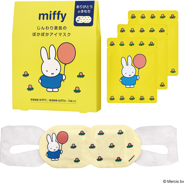 あったか心地よい蒸気で目と目元をじんわり温め、気分もほぐれるアロマタイプの温熱アイマスク。ミッフィーのやさしいイラストと一緒にリラックスタイムを。おひさまを浴びたリネンの香り。
