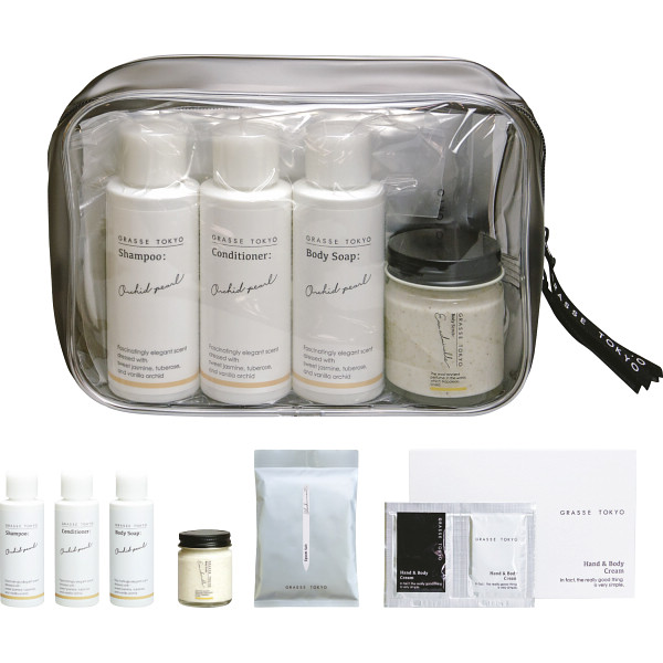 内容 ●セット内容=シャンプー、コンディショナー、ボディソープ各50ml・ハンド&ボディクリーム3g×2包・エプソムソルト150g(1回分)・ボディスクラブ35g・ポーチ1個※シャンプー、コンディショナー、ボディソープ(香り=オーキッドパール)、ハンド&ボディクリーム(香り=ブラックカラント、ウォーターリリー)は各種共通です。 【ハコ無し】