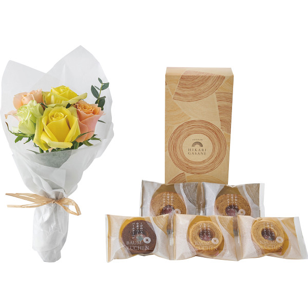新鮮なバラのブーケと、ふんわりとした食感にしっとり優しい甘さのバームクーヘンのギフトセットです。お部屋を華やかに彩るバラとスイーツのセットは、誕生日、御祝、御礼などにぴったりです。幅広い年齢層に喜んでいただけます。