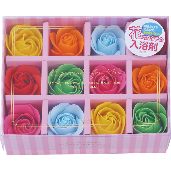 カラフルに並んだ花のカタチの入浴剤。インテリアのアクセントとして飾る空間を演出します。そのまま飾って楽しんだあとは入浴剤としてお風呂に花びらを浮かべて贅沢なひとときをお楽しみいただけます。