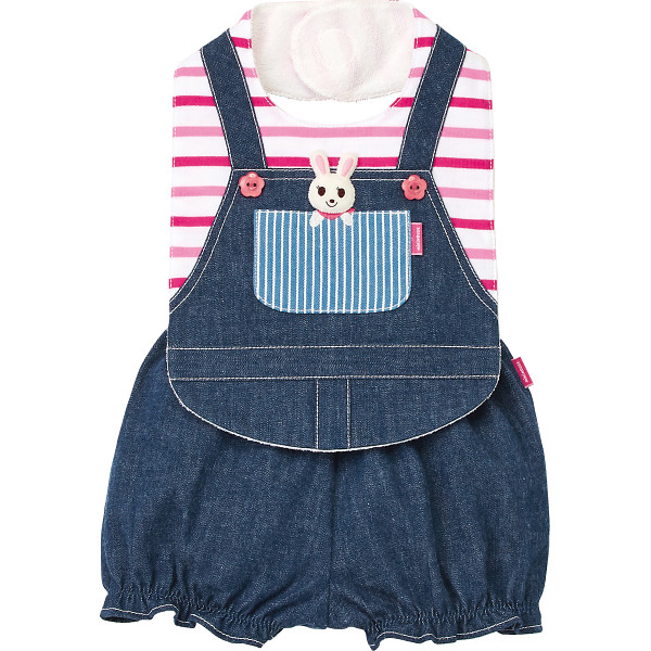 いつものお洋服にさっとつけるだけで、お出かけスタイルになれるスタイ・ブルマセット。重ね着風のデザインと、前ポケットからのぞくミキハウスキャラクターのうさこがポイントです。出産祝いなどのギフトにもおすすめです。
