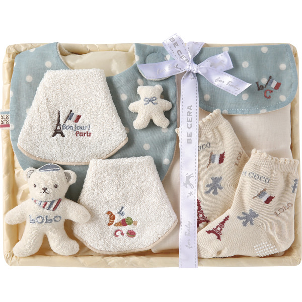 かわいいクマのモチーフとやさしいブルーの水玉柄で、出産お祝いにぴったりのギフトセットです。