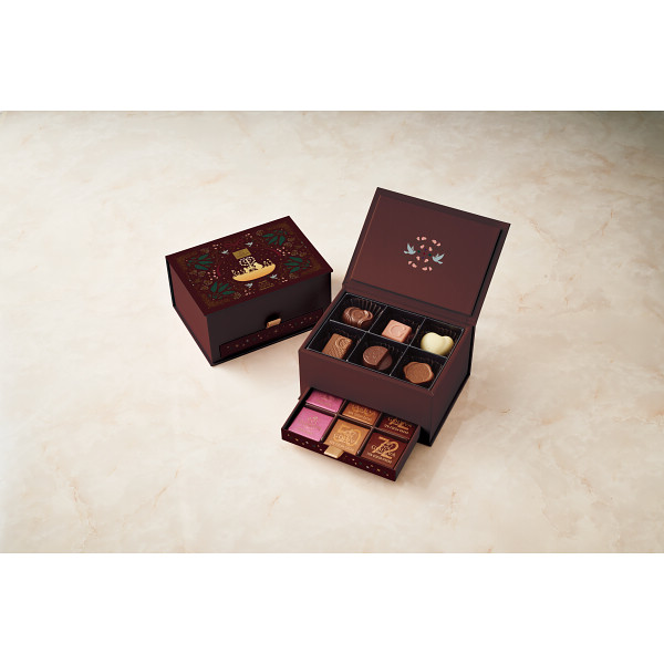 シャディ100周年限定パッケージ。リト@葉っぱ切り絵のアートを入れ込んだスペシャルな商品。ゴディバを代表するハートオブゴールドコレクションの中で愛され続けるチョコレートに人気のカレを加えて、特別なパッケージに詰め合わせました。