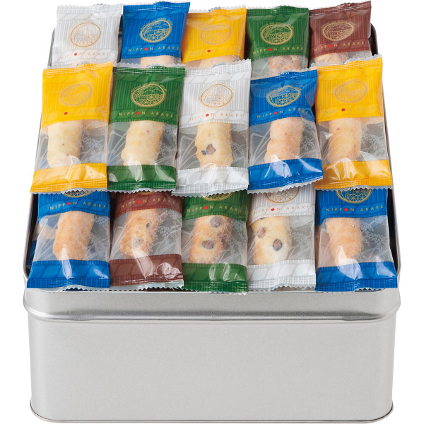 内容 ●4種の味付けおかき(黒豆しょうゆ味・黒豆サラダ味・海老味・梅味)230g 【アレルゲン:小麦・えび】 【缶入】
