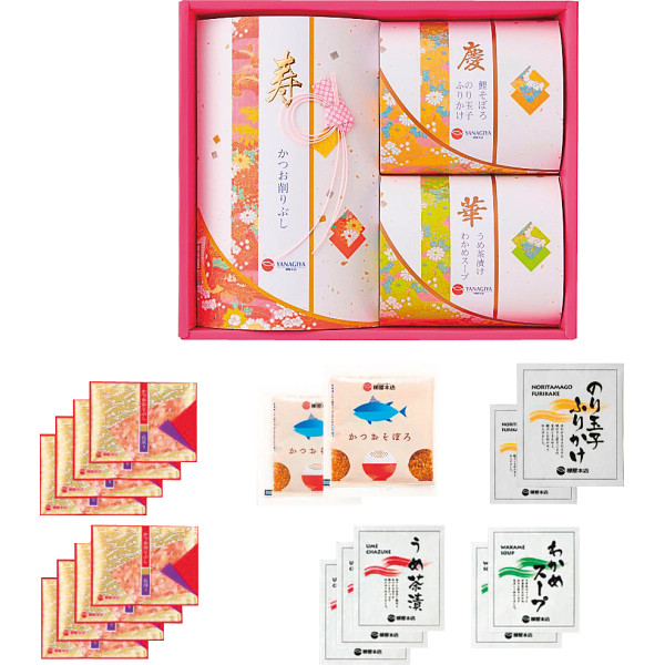 内容 ●花削り3g×8袋×1、鰹そぼろ5g×2、のり玉子ふりかけ4.5g×2、うめ茶漬4.3g×3、わかめスープ5.3g×2※中身包材デザインが変わる場合がございます。 【アレルゲン:卵・乳成分・小麦・えび】 【化粧箱入】