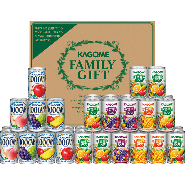 野菜と果物で健康への思いやりをギフトに。3種類の「野菜生活100」とアップルなどの100%ジュースをセットに。ファミリーにもおすすめです。