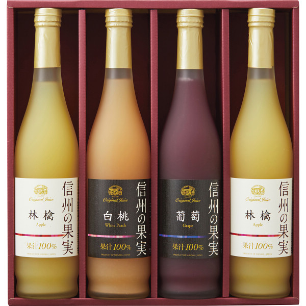 内容 ●林檎ジュース500ml×2、葡萄ジュース500ml・白桃ジュース500ml×各1(※林檎・葡萄・白桃:信州産) 【化粧箱入】