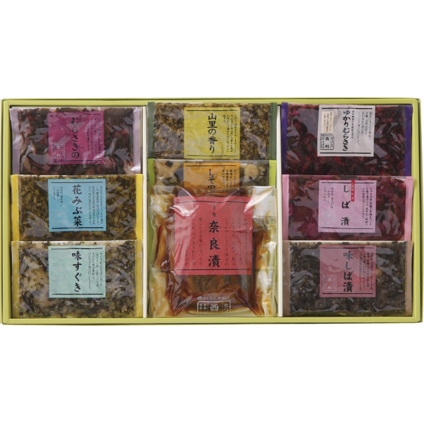 内容 ●うり奈良漬140g、赤しそむらさきの50g、花みぶ菜40g、味すぐき40g、山里の香り40g、ゆかりむらさき40g、しば漬50g、味しば漬40g、しその実漬50g 【アレルゲン:小麦】 【化粧箱入】