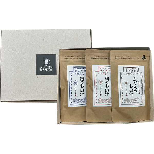 内容 ●鯛のお出汁・まぐろのお出汁・鰹のお出汁 各10g×5 【アレルゲン:小麦】 【化粧箱入】