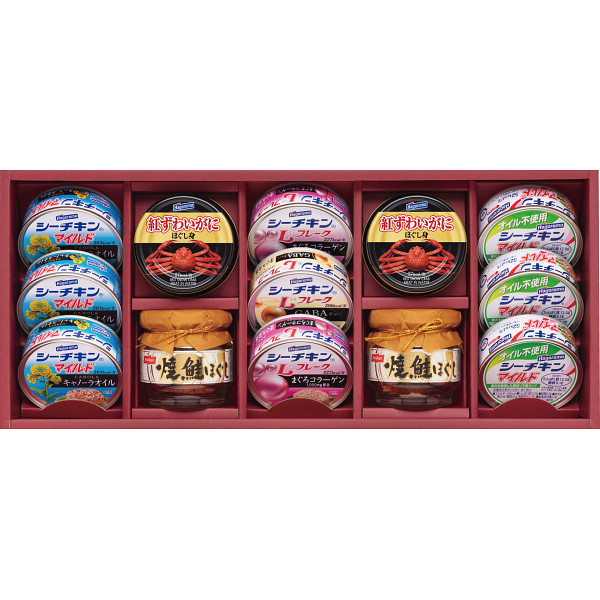 人気のシーフードをバラエティ豊かに詰合せました。シーチキンLフレーク(コラーゲン入り・GABA入り)はギフト専用シーチキンです。