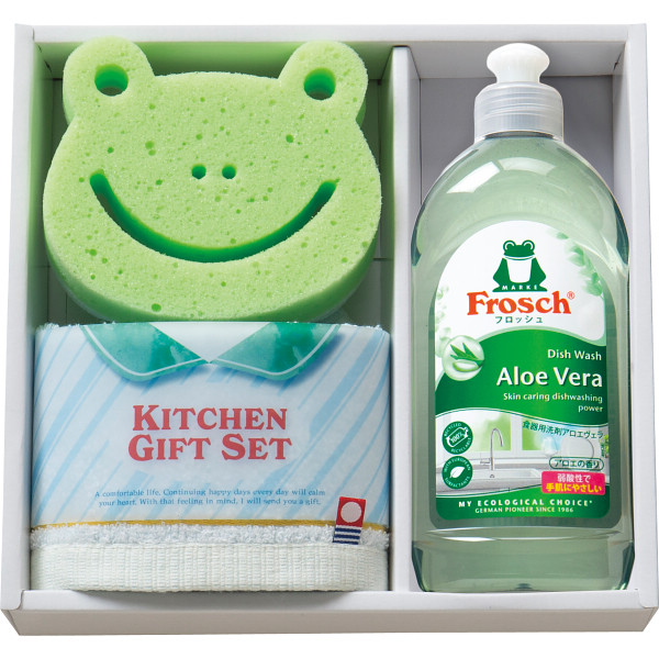 内容 ●ウォッシュタオル1枚・スポンジ1個・フロッシュ食器用洗剤(アロエヴェラ)(300ml)1本 【化粧箱入】 【完成品】