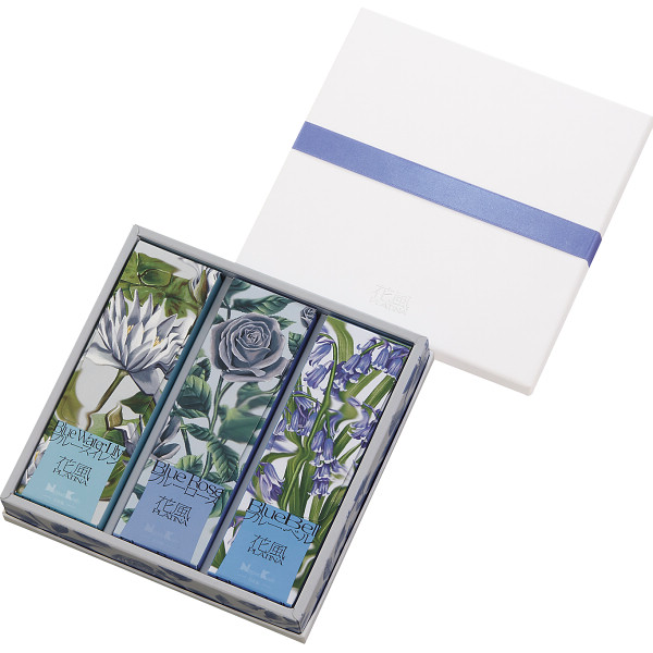 「花風プラチナ」の3つの香りを贈り物に。清らかな白い箱に青いリボンが美しく映える上品なギフトです。