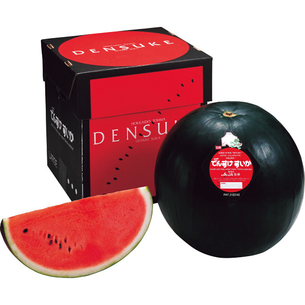北海道の当麻町で唯一生産されています。みずみずしい甘味は一度食べる価値がある極上のスイカです。名前の由来は水田の転作が始まり、稲の代わりにと田を助けるために作ったためでんすけ(田助)になったと言われています。真っ黒の表皮が特長です。
