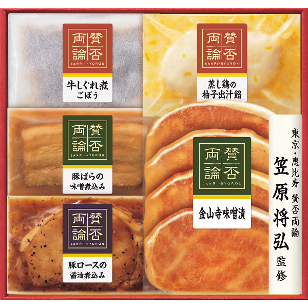 内容 ●賛否両論(蒸し鶏の柚子出汁餡・豚ロース金山寺味噌漬各150g、豚ロースの醤油煮込み・豚ばらの味噌煮込み各70g、牛しぐれ煮ごぼう55g) 【アレルゲン:卵・乳成分・小麦】 【化粧箱入】