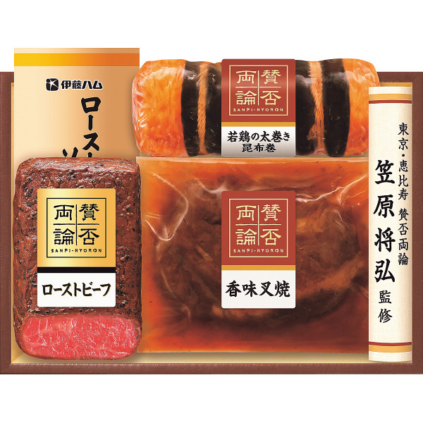 内容 ●賛否両論(ローストビーフ(もも)180g、若鶏太巻き昆布巻200g、香味叉焼180g)、ローストビーフソース(和風ゆず風味)60g 【アレルゲン:卵・乳成分・小麦】 【化粧箱入】
