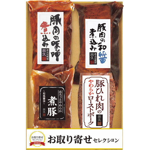 内容 ●豚肉の味噌煮込み210g、豚肉の和醤煮込み210g、ほろっとやわらか煮豚230g、豚ひれ肉のやわらかローストポーク100g 【アレルゲン:乳成分・小麦】 【化粧箱入】