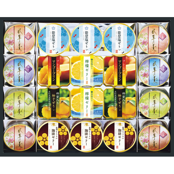 内容 ●水羊羹小倉60g×4、水羊羹練り60g×2、水羊羹抹茶60g×2、能登塩ぜりぃ52g×3、金澤オリジナル珈琲ゼリー52g×3、雪塩入り檸檬ゼリー75g×2、プレミアムマンゴープリン75g×2、蜂蜜入り柚子ぜりぃ75g×2 【アレルゲン:乳成分】 【化粧箱入(包装済)】