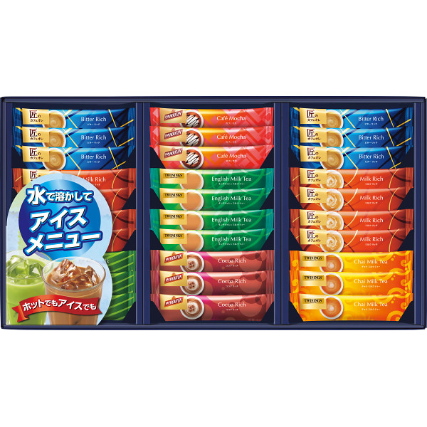内容 ●匠のカフェオレ(ミルクリッチ12.4g×8、ビターリッチ10.6g×6)、トワイニング(イングリッシュミルクティー14.9g×4、チャイミルクティー14.9g×3)、辻利(抹茶ミルク17g×3)、バンホーテン(ココアリッチ18g×3、カフェモカ15g×3) 【アレルゲン:乳成分】 【化粧箱入】