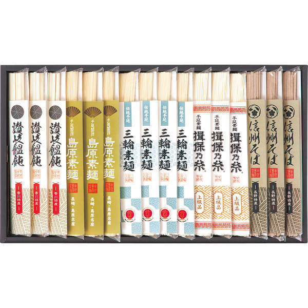 内容 ●三輪素麺50g×4、信州蕎麦・讃岐うどん・揖保乃糸・島原素麺 各50g×3 【アレルゲン:小麦・そば】 【化粧箱入】