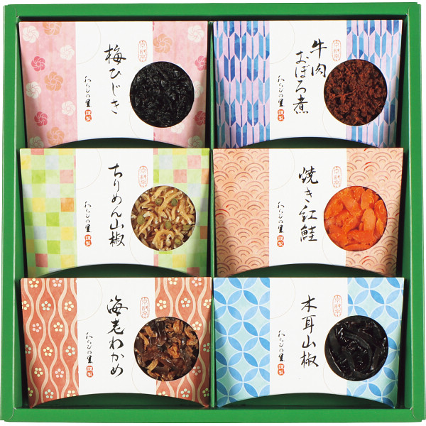 内容 ●ちりめん山椒20g、焼き紅鮭20g、牛肉おぼろ煮20g、木耳山椒30g、海老わかめ30g、梅ひじき30g 【アレルゲン:小麦・えび】 【化粧箱入】