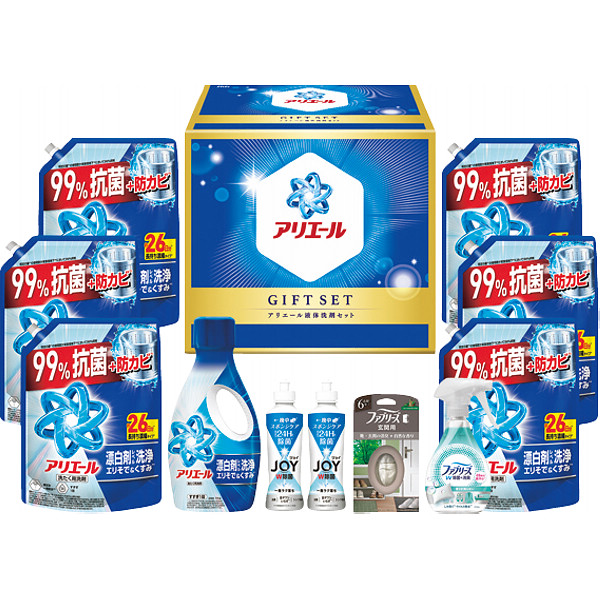 内容 ●アリエールジェル(本体)700g×1、(詰替用)625g×6、除菌ジョイコンパクト170ml×2、ファブリーズ370ml・ファブリーズ玄関用×各1 【化粧箱入】
