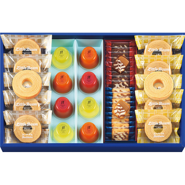 内容 ●リトルバウム(プレーン・レモン×各5)、2層仕立てのフルーツゼリー×8、サンドクッキー×18 【賞味期限:60日】 【アレルゲン:卵・乳成分・小麦】 【化粧箱入】